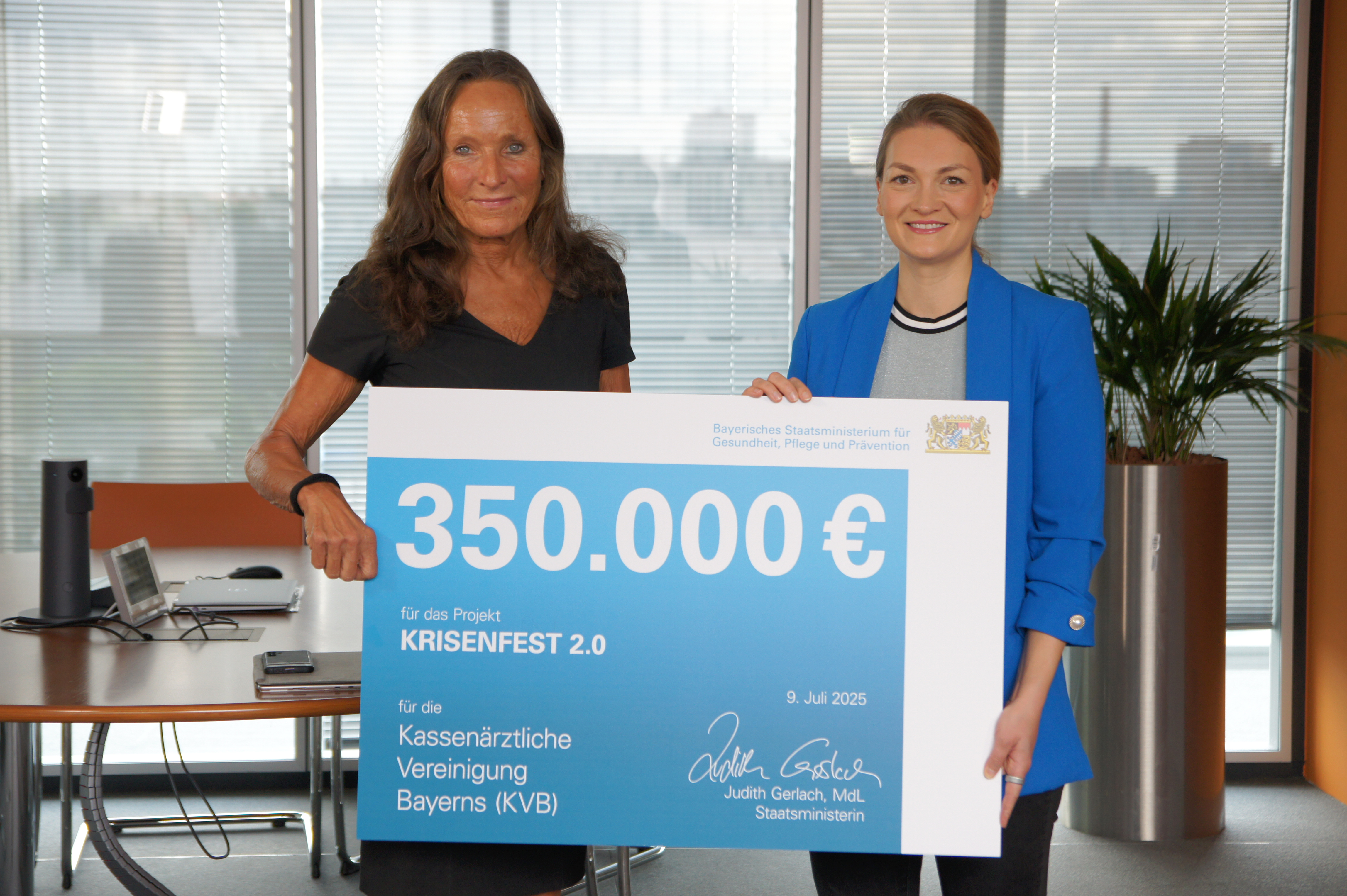 München, 9. Juli 2025: Bayerns Gesundheits-, Pflege- und Präventionsministerin Judith Gerlach hat heute in München einen symbolischen Scheck in Höhe von 350.000 Euro an Dr. Claudia Ritter-Rupp, zweite stellvertretende Vorstandsvorsitzende der Kassenärztlichen Vereinigung Bayerns (KVB), überreicht. Mit der Fördersumme kann das erfolgreiche Präventionsprogramm KRISENFEST auch in den kommenden beiden Jahren fortgesetzt werden.